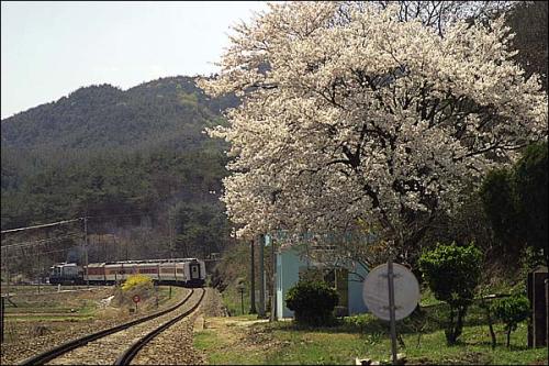 이제껏 보아온 역 중에서 가장 작은 곳이라 할만하다. 낙동강의 세평짜리 간이역이라는 봉화 승부역보다 더 작다. 그나마 역 주변에 개나리와 벚꽃이 만개해 화려한 풍광을 자랑한다. 꽃마저 없었다면 정말 썰렁한 공간으로 다가왔을 것이다.