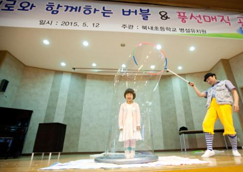 북내초등학교 병설유치원(원장 김경순)에서는 5월 12일, 가정의 달과 어린이날을 기념하여 원내체험행사로 ‘삐에로와 함께 하는 버블 & 풍선매직’ 공연을 개최하였다. 북내 본교와 분교 유치원 원아들뿐만 아니라 북내초 전교생, 학부모, 교직원, 지역 에벤에셀 어린이집 원아 등 200여명이 참여한 버블 매직 공연은 모처럼 지역교육가족에게 웃음과 행복을 전하는 좋은 기회가 되었다.
