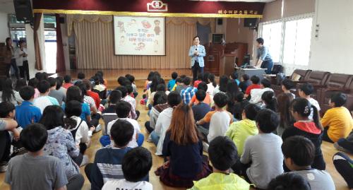6학년 선생님의 안내를 받아 강의실에 들어가, 처음 본 학생들이지만 자연스럽게 인사를 하는 학생들이 있었다. 강의 시간이 시작되어 제작한 파워포인트 자료를 활용하여 문답식으로 수업을 진행하였다. 다른 학교 같으면 다소 소란스럽게 느낄 수 있는 시간인데도 학생들의 수업을 받는 태도가 매우 진지하게 느껴졌다. 앉는 자세를 포함하여 질문에 답하고 발표하는 모습이 활발하고 매우 의젓하게 느껴졌다. 주변을 둘러 보니 6학년 선생님들이 계시는데 학생들의 이러한 자세는 하루 아침에 이뤄지는 것이 아니라 꾸준히 지도한 결과라고 생각되었다. 선생님들께도 잘 지도하여 주신다고 감사의 말씀을 드렸지만 이에 잘 따른 학생들의 모습이 너무 예뼜다.