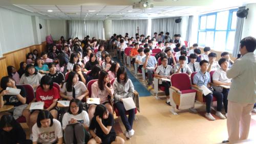 곡성중학교(교장 강대철)는 곡성군 관내 주변 소규모 학교를 통합하여 적정화 한 학교이다. 6월 7일(화요일) 오전 10시 45분부터 한 시간 동안 3학년을 대상으로 필자가 나라사랑 수업을 실시하였다. 소강당에는 3학년 학생이 모여 수업 준비를 하고 있었다. 강대철 교장 선생님이 강사를 소개하고 수업을 문답식으로 진행하였다.