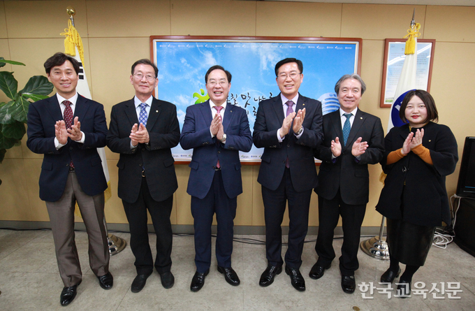 교육시설재난공제회 박구병 회장(왼쪽 네 번째)이 27일 교총을 방문, 하윤수 회장과 각급 학교 재난대응 역량 강화 교육 등 양 기관의 협력방안을 논의했다.