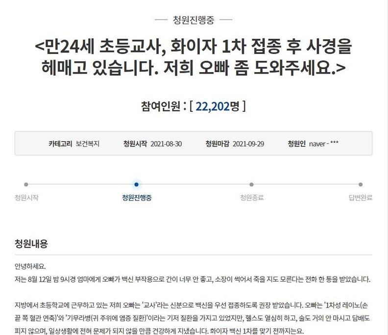 교총은 "2차 접종을 마친 교직원 중 근육통, 발열 등 부작용을 호소하는 사례가 많아 불안감이 증가하고 있을 뿐 아니라 학사 운영에 차질이 발생할 수 있다"고 우려했다. 실제로 최근 며칠 사이 청와대 게시판에는 백신접종 후 심각한 의심 증상을 보이는 교원의 사례가 연이어 등장했다. 특히 해당 교원이 20~30대 청년층이어서 교직사회에 던지는 충격이 크다.