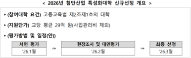교육부와 한국산업기술진흥원은 18일 ‘2026년 첨단산업 특성화대학 재정지원사업’ 운영계획(안)을 안내했다. 이번 계획은 특성화대학 선정 희망 대학의 준비기간 확보 등을 위한 사전 안내로, 정부안 기준으로 선정 규모 등이 제시됐다. 이후 국회 예산안 확정 시 그 결과가 반영돼 공고될 전망이다. ‘첨단산업 특성화대학 재정지원사업’은 첨단산업 분야의 혁신을 이끌 학사급 전문 인재를 배출하고 석·박사급 고급 인재 양성의 기반을 구축하는 것이 목적이다. 구체적으로 ▲기초과학·기업 협업 교과목 확대 ▲우수 교원 확보 및 교육·실습 환경 구축 ▲탄력적인 학사-교원 인사제도를 촉진하기 위해 정부가 집중적으로 재정지원을 하게 된다. 2025년에는 반도체 20개 사업단(30개교), 이차전지 5개교, 바이오 3개교를 대상으로 1167억 원의 예산을 지원해 분야별로 대학의 역량과 강점에 기초한 특성화 인재양성 체계가 마련된다. 지난 5월 ‘국가첨단전략기술 지정 등에 관한 고시’ 일부개정에 따라 2026년에는 국가첨단전략기술에 새롭게 포함된 ‘로봇 분야’이 신설돼 바이오 2개교, 로봇 3개교 선정 등 총 1209억 원 지원 예정이다. 교육부는 특성화대학의 성공적인 운영을