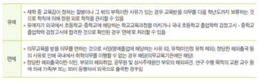들어가며 최근 특정 지역의 초등학교 취학 연령 아동 10명 가운데 1명은 법정 의무교육을 포기하고 있으며, 이들 중 절반에 해당하는 학생은 해외유학이나 미인가 교육시설에서 교육받기 위해 취학을 포기하고 있는 것으로 나타났다. 또한 2020년 교육부 통계에 의하면 다문화학생 수는 약 14만 7400명으로 2012년 조사 시행 이후 지속적인 증가 추세를 보였다. 이와 더불어 2019학년도 초·중·고교 학업중단학생 수는 감소했으나 학업중단율은 전 학년도 대비 0.1% 상승하였다. 세계화·국제화된 사회는 다양한 문화를 경험하고, 지구의 문제를 함께 해결할 수 있다는 장점이 있으나, 양극화 및 빈부격차로 인한 교육적 문제점에 대한 실질적인 대책이 필요하다는 의견도 제시되고 있다. 이에 학적관리 중 질병·발육상태 등 부득이한 사유로 취학할 수 없는 유예·면제 대상 학생과 외국에서 귀국한 학생, 재외국민의 자녀인 학생, 북한이탈주민 학생, 외국인 학생 등의 학적관리 방법을 살펴보고자 한다. 유예·면제·정원 외 학적관리 가. 유예 및 면제의 개요 「초·중등교육법」 제14조(취학의무의 면제 등)는 질병·발육상태 등 부득이한 사유로 취학이 불가능한 의무교육대상자에 대하여는