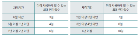 지난 호에서는 「국가공무원 복무규정」 등을 토대로 교원의 근무에 대하여 알아보았습니다. 「국가공무원 복무규정」 제24조의2에 따라 교원의 휴가에 관해서는 학사 일정 등을 고려하여 교육부 장관이 따로 정할 수 있어 특례로서 「교원휴가에 관한 예규」를 규정하고 있습니다. 이에 따라 교원의 휴가에 관해서는 「교원휴가에 관한 예규」를 우선 적용하되, 성질에 반하지 않는 한 「국가공무원 복무규정」 및 「국가공무원 복무·징계 관련 예규」도 함께 적용합니다. 이번 호부터는 교원의 휴가에 대해서 살펴보겠습니다. 1. 근거 1) 「국가공무원 복무규정」 제14조(휴가의 종류) 공무원의 휴가는 연가(年暇)·병가·공가(公暇) 및 특별휴가로 구분한다. 2) 「국가공무원 복무규정」 제15조(연가일수) ① 공무원의 재직기간별 연가일수는 다음과 같다. 다만 법 제28조 제2항 제2호·제3호 및 제10호에 따라 임용된 경력직공무원 및 특수경력직공무원의 재직기간이 5년 미만이면서 인사혁신처장이 정하는 공무원 경력 외의 유사경력이 있는 경우에는 5년 미만의 재직기간별 연가일수에 각각 3일을 더한다. ② 제1항에서 ‘재직기간’이란 「공무원연금법」 제25조 제1항부터 제3항까지의 규정에