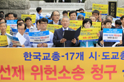교육민주화에 경도돼 교육 전문성, 정치중립성 훼손 정치교육감 실험정책에 학생·학부모 등 기본권 침해 “대한민국 교육, 대한민국 살리기에 全국민 지지 호소” 한국교총과 17개 시도교총이 교육의 정치예속화와 학교정치장화를 초래한 교육감직선제에 대해 14일 위헌 소송을 청구했다. 2006년 지방교육자치법 개정 후, 도입된 교육감직선제에 던지는 첫 위헌 소송에 대해 교총은 “정치로부터 대한민국 교육의 독립을 선포하는 역사적 의미를 담고 있다”고 청구 취지를 분명히 했다. 교총은 이날 오전 11시, 100여명의 학부모, 교원, 시민들과 헌법재판소 앞에서 위헌 소송 청구 기자회견을 열고 “‘교육감직선제의 근거조항인 지방교육자치에 관한 법률 제43조는 헌법에 위반된다’는 결정을 구하는 위헌 소송을 청구한다”고 밝혔다. 정치·이념선거로 변질돼 헌법가치인 교육의 자주성?전문성?정치적 중립성을 심대히 훼손하는 교육감직선제에 대해 위헌의 종지부를 찍겠다는 의지다. 이미 교총은 2010년 6월, 1기 직선교육감 선거 후부터 성명, 기자회견, 대의원회 결의 등을 통해 정치선거, 금품선거가 노골화된 교육감직선제에 대해 위헌 소송 의사를 밝혀왔다. 안양옥 교총회장은 기자회견문에서 “당