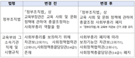 국회는 26일 본회의에서 정부조직법 수정안을 여당 주도로 의결했다. 정부조직법 수정안은 이날 본회의에서 재석 의원 180명 가운데 찬성 174명, 반대 1명, 기권 5명으로 통과됐다. 법안에 반대하는 국민의힘은 표결에 불참했다. 조국혁신당에서 신장식·차규근·백선희 의원 등은 기권표를 행사했으며 개혁신당 천하람 의원은 반대표를 던졌다. 이 법안은 30일 국무회의도통과했다. 이번 법 통과로 10월 1일부터 기존 교육부 장관이 겸임하던 사회부총리는 폐지된다. 사회부총리는 교육·사회·문화 정책 관련 총괄 조정하는 역할을 해왔다. 사회부총리를 보좌하기 위해 뒀던 차관보, 사회정책협력관, 사회정책총괄담당관 자리도 사라진다. 29일 교육부에 따르면 정부조직법상 교육부 차관보 근거 조항은 유지됐으나, 교육부와 그 소속기관 직제 및 시행규칙에서 폐지됐다. 이와 관련해 김영곤 차관보는 사의를 표명한 상황이다. 교육부는 “이번 개편으로 사회부총리 역할을 맡지 않게 됐지만, 교육부는 여전히 국가 교육정책과 인재정책을 총괄하는 주무부처로서 그 중심적인 역할을 계속해서 수행해 나갈 것”이라며 “국정과제도 적극 추진 예정”이라고 전했다.
