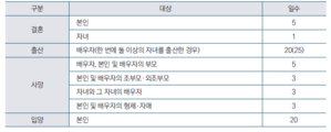 지난 호에서는 휴가의 개념, 실시 원칙, 교원의 연가·병가·공가에 대하여 알아보았습니다. 이 외에 사회통념 및 관례상 특별한 사유가 있는 경우에 대하여 「국가공무원 복무규정」 제20조와 「교원휴가에 관한 예규」 제8조에 특별휴가에 관한 사항을 규정하고 있습니다. 이번 호에서는 교원의 특별휴가의 종류와 사용방법 등에 대하여 살펴보겠습니다. 1 경조사휴가 1) 행정기관의 장은 소속 공무원이 결혼하거나 그 밖의 경조사가 있는 경우에는 해당 공무원의 신청에 따라 경조사별 휴가일수에 따른 경조사휴가를 주어야 함. 2) 경조사별 휴가일수 3) 경조사휴가는 그 사유가 발생한 날을 포함하여 전후에 연속하여 실시하는 것이 원칙*이나, 본인 결혼(결혼식일 또는 혼인신고일)은 그 사유가 발생한 날부터 30일 이내의 범위에서, 배우자 출산 휴가의 경우 출산예정일 30일 전부터 출산 후 120일 이내의 범위에서 3회에 한정(4구간)하여 나누어 사용 가능함. * 토요일·공휴일로 인하여 분리되는 경우를 제외하고는 분할 사용 불가 ※ 배우자가 한 번에 둘 이상 자녀를 출산한 경우에는 출산 후 150일 이내의 범위에서 5회에 한정(6구간)하여 나누어 배우자 출산 휴가 사용이 가능함. 4) 사망으로 인한 경조사휴가의 경우 그 사유가 발생한 날(사망일 또는 장례일) 또는 사망일 다음 날부터 휴가를 사용할 수 있음. ※ 장례일로 변경한 경우 이를 증빙하는 자료를 요구할 수 있음. 5) 경조사휴가는 일 단위로만 사용할 수 있음. 6) 입양 이외의 경조사휴가를 실시함에 있어 원격지일 경우에는 2일 범위에서 왕복 소요 일수를 가산할 수 있음. 이 경우 원격지라 함은 가장 빠른 교통수단으로도 왕복 8시간 이상 소요되는 지역을 말함. ※ 본인 결혼 경조사휴가의 경우 원격지는 결혼식장을 기준으로 함. [PART VIEW] 2 출산휴가 1) 임신하거나 출산한 교원에 대하여 출산 전후를 통하여 90일의 출산휴가를 사용할 수 있으며, 출산 후의 휴가기간이 45일 이상이 되게 함. - 다만 한 번에 둘 이상의 자녀를 임신한 경우에는 120일의 출산휴가를 사용할 수 있으며, 출산 후의 휴가기간이 60일 이상이 되게 함. ※ 휴가기간의 배치는 의료기관의 진단서에 의한 출산예정일을 기준으로 하되, 조산의 우려 등 특별한 경우는 예외 인정 - 출산일 전에 육아휴직 등 휴직 중인 경우에는 실제 출산일에 맞춰 복직한 후, 출산휴가를 신청하는 것이 바람직함. [사례] 육아휴직 중인 여성공무원이 출산휴가 사용을 위해 출산예정일(2020.9.14.)에 맞춰 미리 복직신청을 하였음. 그러나 출산예정일보다 일찍 출산(9.7.)하게 되었음에도 불구하고 이에 따른 복직신청을 변경하지 않아 인사부서에서는 2020년 9월 14일부로 해당 여성공무원에 대한 복직과 동시에 출산휴가 처리를 완료하였음. 하지만 출산휴가는 실제 출산일(9.7.)로부터 90일까지 사용할 수 있으므로 해당 여성공무원은 결국 총 83일의 출산휴가만 사용할 수 있음. - 「모자보건법 시행령」 제1조의2 제1호에 따른 미숙아(임신 37주 미만의 출생아 또는 출생 시 체중이 2천500그램 미만인 영유아)를 출산하여 1일 이내에 신생아중환자실에 입원한 경우에는 100일의 출산휴가를 사용할 수 있음. 이 경우 출산휴가를 추가로 부여받기 위해서는 출산휴가 종료예정일(90일 기준) 7일 전까지 미숙아 출산 사실을 증명할 수 있는 출생보고서 또는 출생증명서, 생후 1일 이내 신생아중환자실 입원기록을 확인할 수 있는 진료비 세부내역서나 진단서 등을 제출하여야 함. 2) 임신 중인 공무원은 다음 중 어느 하나의 사유에 해당하는 경우, 출산 전 어느 때라도 최장 44일(한 번에 둘 이상의 자녀를 임신한 경우에는 59일)의 범위에서 출산휴가를 나누어 사용할 수 있음. •임신 중인 공무원이 유산·사산의 경험이 있는 경우 •임신 중인 공무원이 출산휴가를 신청할 당시 연령이 만 40세 이상인 경우 •임신 중인 공무원이 유산·사산의 위험이 있다는 진단서를 제출한 경우 3) 임신 중 유산 또는 사산한 여성공무원은 다음 기준에 따라 유산·사산휴가를 사용할 수 있음. 다만 인공임신중절수술(「모자보건법」 제14조 제1항의 규정에 의한 경우는 제외)에 의한 유산의 경우는 휴가를 사용할 수 없음. •임신기간이 15주 이내인 경우: 유산 또는 사산한 날로부터 10일까지 •임신기간이 16주 이상 21주 이내인 경우: 유산 또는 사산한 날부터 30일까지 •임신기간이 22주 이상 27주 이내인 경우: 유산 또는 사산한 날부터 60일까지 •임신기간이 28주 이상인 경우: 유산 또는 사산한 날부터 90일까지 ※ 1주는 7일이므로, 임신 106일부터 147일까지 30일, 임신 148일부터 189일까지는 60일, 임신 190일 이후는 90일 ※ 휴가기간은 원칙적으로 유산·사산한 날부터 기산함(유산·사산한 날이 지난 이후에 휴가를 신청하여 사용할 경우 유산·사산한 날부터 휴가를 사용하는 날의 전날까지의 일수를 휴가 사용 가능 일수에서 제외). 다만 유산·사산한 날에 출근하여 당일부터 유산·사산휴가를 온전히 사용할 수 없는 경우에는 유산·사산한 날의 다음 날부터 기산하여 사용할 수 있음. 4) 배우자가 유산하거나 사산한 경우 남성공무원은 3일의 배우자 유
