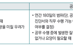 질병휴직은 교원이 재직 중 신체상·정신상의 장애로 직무에 종사할 수 없는 사유가 발생한 경우 질병치료의 기회를 부여하여 교원의 신분을 보장하기 위해 만들어진 제도입니다. 질병휴직의 기본적인 사항과 운영 원칙 등 선생님께서 꼭 알고 계셔야 할 사항을 안내해 드립니다. ■ 법적 근거 「교육공무원법」 제44조(휴직) 및 제45조(휴직기간 등)의 각 제1항 제1호 ■ 질병휴직과 공무상 질병휴직 비교 자주 묻는 질문 QA Q. 질병휴직기간이 끝난 뒤, 동일 사유로 병가 승인이 가능할까요? A. 「국가공무원 복무·징계 관련 예규」에 따라 질병휴직은 질병·부상의 완쾌 등 휴직사유가 소멸된 경우에 복직할 수 있습니다. 따라서 질병휴직 종료 직후 동일 사유로 연속하여 병가를 승인받을 수 없습니다. 다만 복직 후 정상근무 상태가 일정 기간 유지된 후 재발한 경우에는 병가 승인이 가능합니다. Q. 1년(부득이한 경우 2년)의 휴직기간이 만료된 후 복직하여 정상근무 중에 동일 질병이 재발한 경우 어떻게 처리하나요? A. 복직 후의 근무가 완전하고, 정상적인 상태에서 상당기간 지속되었다면, 재발한 질병의 정도, 요양기간, 요양 후 정상적인 근무수행 여부 등을 종합적으로