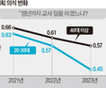 ‘서이초 사건’ 이후 젊은 교사의 정년 의지가 크게 줄어든 것으로 나타났다. 한국교원교육학회의 정기간행물 한국교원교육연구(계간) 최근호에 수록된 ‘서이초 사건 이후 교사의 정년 계획 인식 변화’ 논문에 이런 연구 내용이 담겼다. 신은영 서울은명초 교사가 한국교육개발원의 ‘한국초등교원종단연구’ 2021∼2023년 3개년 조사에 참여한 교사 1218명의 데이터를 분석한 결과다. 이에 따르면 20~30대 교사들에게서 정년까지 교직을 수행하겠다는 의지가 매년 감소하고 있다. ‘정년까지 교사 일을 하겠느냐’ 질문에 ‘예’라고 응답한 사람을 1, ‘아니오’라고 답한 사람을 0으로 설정했을 때 2023년 20·30 교원의 평균값은 0.45다. 1에 가까울수록 정년 의지가 강하다는 뜻이다. 전년에는 0.57로 1년 만에 0.12 감소한 것이다. 2021년에서 2022년 사이의 감소폭(0.06)과 비교하면 2배 수준이다. 40대 이상 교사들 역시 2022년 0.61에서 2023년 0.57로 정년 의지가 감소했으나 폭은 20·30 세대의 약 3분의 1에 그쳤다. 정년을 채우겠다는 20·30대 교사들이 급감한 때인 2023년은 ‘서이초 사건’이 발생한 시기와 맞물린다