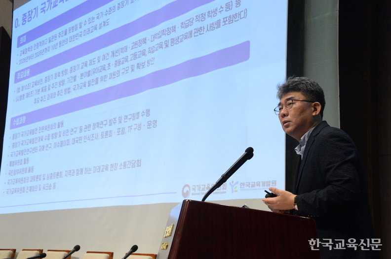 황준성 국가교육발전연구센터장이 25일 오후 서울 중구 한국프레스센터에서 열린 국교위 2주년 토론회에서 '중장기 국가교육발전계획 주요 방향(안)'을 주제로 발제 하고 있다.