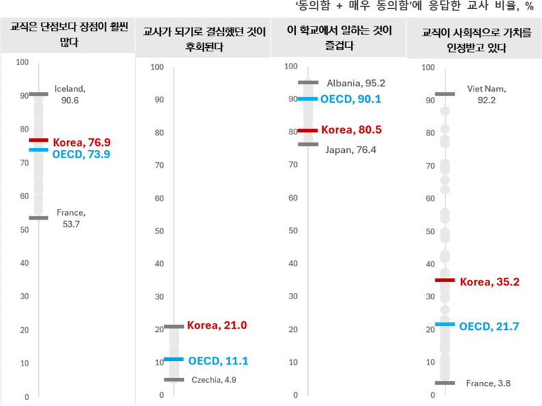 교직을 단점보다 장점이 많은 직업이라 생각하는 한국 교사는 76.9%로 OECD 평균(73.9%)보다 높았지만, 교사가 된 것을 후회하는 교사 비율이 21%로 조사 대상국 중 가장 높았다. 교직이 사회적으로 인정받고 있다고 인식하는 교사의 비율은 35.2%로 OECD 평균(21.7%)보다 높았으나, 2018년 TALIS 조사와 비교해 32%p 떨어졌다.