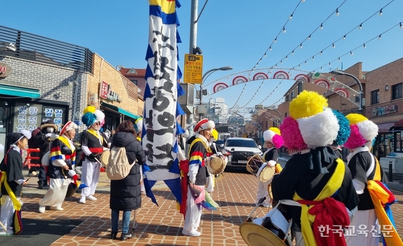 이날 무대에는 단원 20명이 함께했다. 대부분이 중장년층이지만 초등학생 단원 두 명도 당당히 줄을 섰다. 공연은 길놀이로 문을 열어 시민들의 시선을 끌었고, 이어 삼도 사물놀이, 수원농악 순서로 약 40분간 진행됐다.
