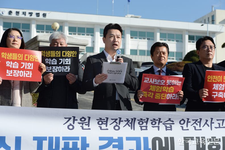 장재희 강원교총 회장은 연대사를 통해 “선고유예는 결국 교사에게 책임을 물어 유죄를 인정한 판결이기에 교육활동 위축이라는 근본적인 문제가 여전히 남게 됐다”며 “교사의 헌신이 형사처벌로 돌아오는 구조 속에선 교육이 지속될 수 없으며, 안전이 보장되지 않는 체험학습은 결코 강요되선 안 된다”고 주장했다.