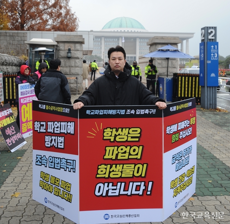 한국교총이 반복되는 학교 급식·돌봄 파업으로 발생하는 학생 피해를 막고, 국제 기준에 부합하는 교원 시민권을 회복하기 위해 국회 앞 릴레이 1인 시위에 돌입했다. 학교의 기본 기능을 보호하고 교원의 정치기본권을 바로 세우기 위한 입법 필요성을 다시 강조하기 위해서다.