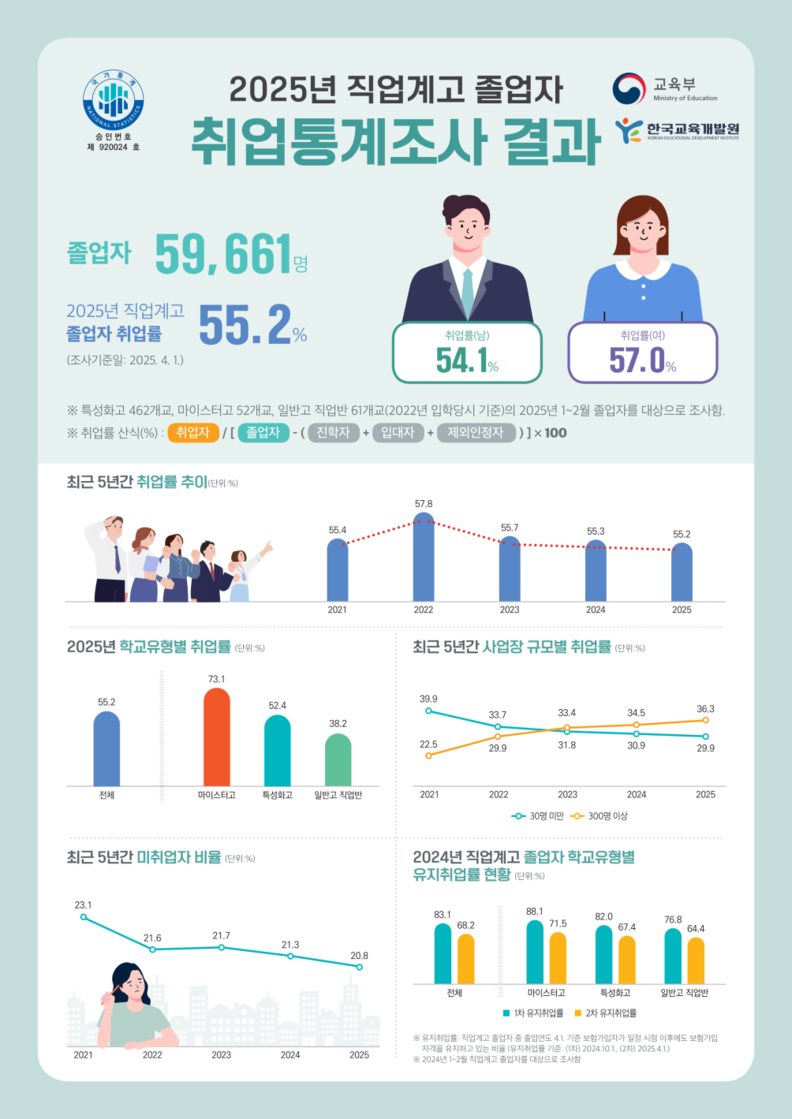 2025년 직업계고 졸업자 5만9661명 중 취업자는 1만5296명, 진학자 2만9373명, 입대자 1523명, 제외인정자(조사기준일 당시 경제활동이 어려운 자)는 1049명이다. 취업률은 전체 졸업자에서 진학자와 입대자, 제외인정자를 제외하고 계산된다.