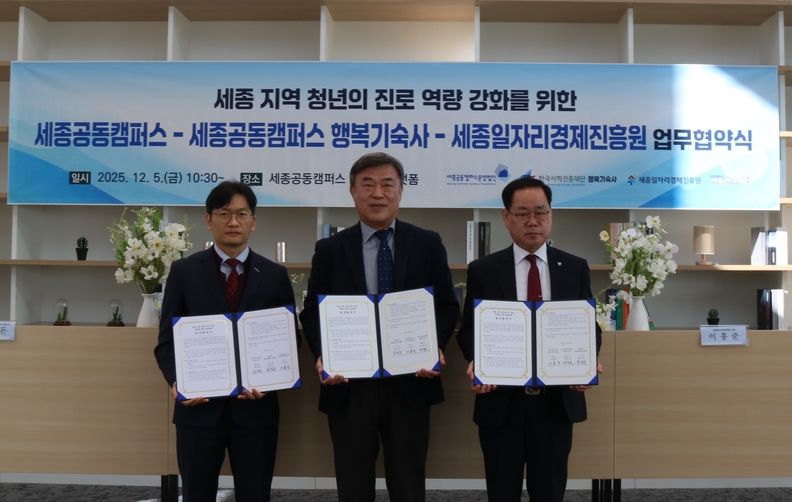 한국사학진흥재단(이사장 이하운)은 5일 세종공동캠퍼스 운영법인, 세종특별자치시일자리경제진흥원과 ‘세종 지역 청년 진로·취창업 역량 강화를 위한 업무협약(MOU)’을 체결했다.