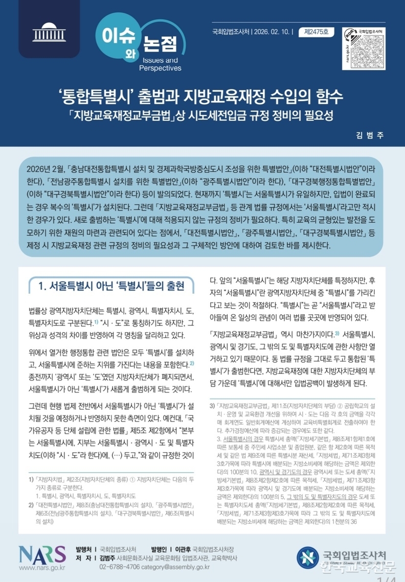 국회입법조사처는 10일 발간한 ‘이슈와 논점’ 보고서를 통해 통합특별시 설치가 지방재정뿐 아니라 지방교육재정 수입에도 직접적인 영향을 미친다고 분석했다.