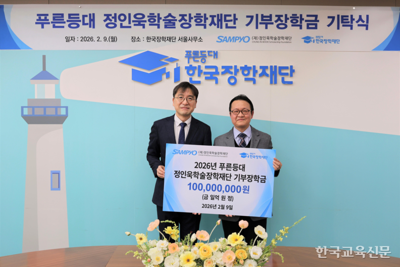 한국장학재단은 9일 서울 중구 재단 서울사무소에서 정인욱학술장학재단과 함께 ‘2026년 푸른등대 정인욱학술장학재단 기부장학금 기탁식’(사진)을 개최했다고 10일 밝혔다.