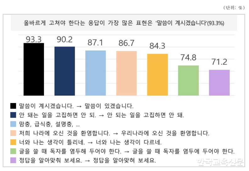 조사 결과 전체 30개 항목에 대해 ‘바꿔야 한다’고 응답한 비율은 평균 61.8%였으며, 13개 항목은 개선 필요 응답이 70% 이상으로 나타났다. 가장 높은 개선 필요 응답률을 기록한 항목은 ‘과도한 높임 표현’으로, 응답자의 93.3%가 “바꿔야 한다”고 답했다. 이는 공공장소나 서비스 업계에서 흔히 사용되는 ‘사물 존칭’이 국민에게 어색하고 부자연스러운 언어로 받아들여지고 있음을 보여주는 결과로 풀이된다.