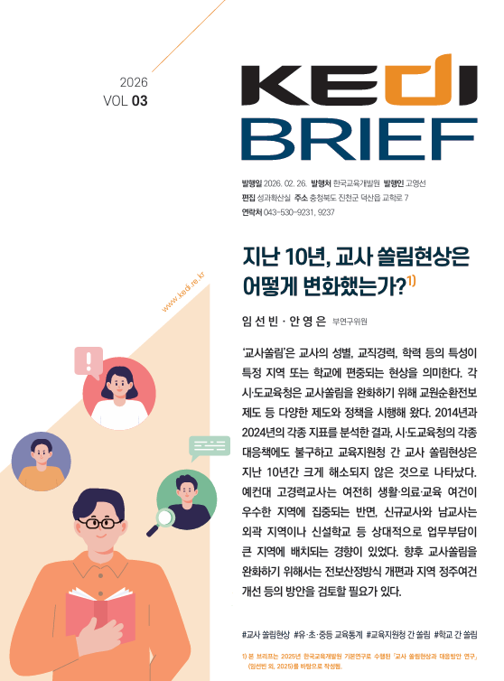 한국교육개발원은 26일 온라인 기자설명회를 열고 2026년 KEDI Brief 제3호 ‘지난 10년, 교사 쏠림현상은 어떻게 변화했는가’를 발표했다. 이번 브리프는 2014년과 2024년 유·초·중등 교육통계 데이터를 활용해 시·도교육청 내 교육지원청 간, 학교 간 교사 특성의 편중 변화를 실증 분석한 결과를 담았다.