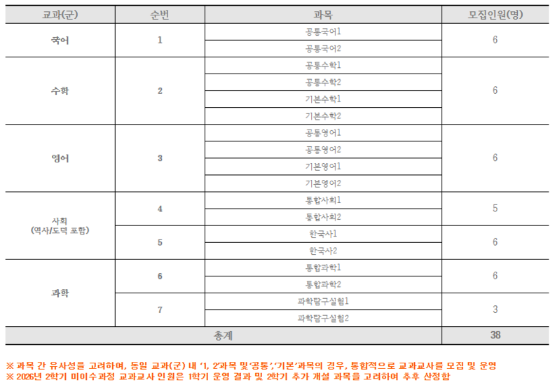 영어 역시 공통영어와 기본영어 1·2 과정에 6명을 배정했다. 사회 교과군은 통합사회와 한국사를 포함해 총 10명을, 과학 분야는 통합과학과 과학탐구실험을 중심으로 10명을 선발해 전체 38명 규모의 교수진을 구성할 계획이다.