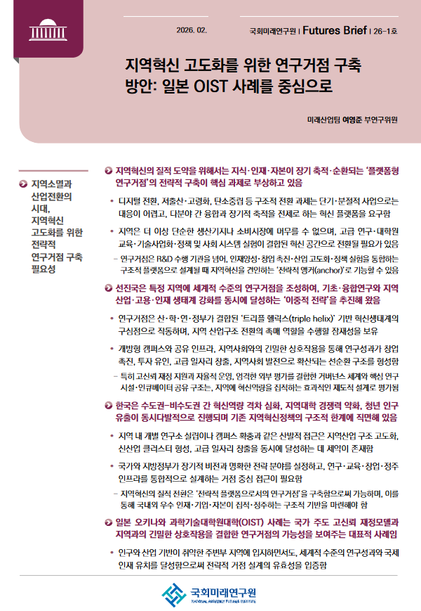 브리프는 수도권과 비수도권 간 혁신역량 격차 확대, 지역대 경쟁력 약화, 청년 인구 유출이 동시에 진행되면서 기존 지역혁신 정책이 구조적 한계에 직면했다고 진단했다. 개별 연구소 설립이나 캠퍼스 확충 같은 분산적 접근으로는 산업 고도화와 고급 일자리 창출을 동시에 달성하기 어렵다는 것이다. 특히 단년도 과제 공모를 반복하는 재정 체계가 연구의 장기성과 도전성을 제약하는 구조로 작용하고 있다고 분석했다.