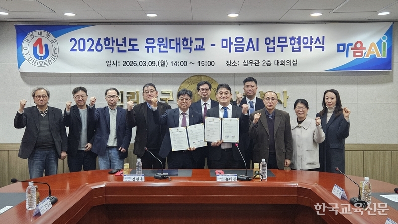 유원대가 인공지능 전문기업 마음AI와 업무협약을 체결하고 인공지능(AI) 분야의 교육 및 연구 역량 강화에 나섰다. 9일 충북 영동캠퍼스 심우관 대회의실에서 열린 이번 협약식(사진)은 산업 현장의 변화에 맞춘 인재 양성을 목적으로 마련됐다.