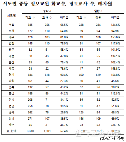 특히 시도별 배치율을 비교한 결과 지역 간 편차가 뚜렷하게 나타났다. 일부 지역은 상대적으로 높은 배치율을 보였지만, 상당수 지역은 평균에도 미치지 못하는 수준으로 확인됐다. 이로 인해 학생들이 거주 지역에 따라 정보·AI 교육을 접할 수 있는 여건이 달라질 수 있다는 점이 문제로 지적된다.