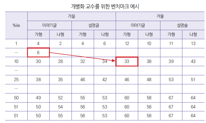 그러나 집중교수가 실제로 작동하려면 학생의 진단 데이터를 기반으로 목표를 설정하고, 학생이 교사의 지도에 잘 반응하는지 판단할 수 있는 체계가 필요하다. 이것이 바로 DBI이다. DBI에서 사용되는 핵심 진단 도구는 앞서 언급한 CBM이며, 여기에 벤치마크(발달 규준)가 더해질 때 그 효과는 더욱 커진다. 벤치마크를 활용하면 ‘이 학생이 또래 대비 어느 수준인가’, ‘이 속도로 성장하면 학년말에 어디쯤 도달하는가’를 구체적으로 예측할 수 있어 교사가 장기목표를 설정하고 교수 강도를 조정할 근거가 생긴다.