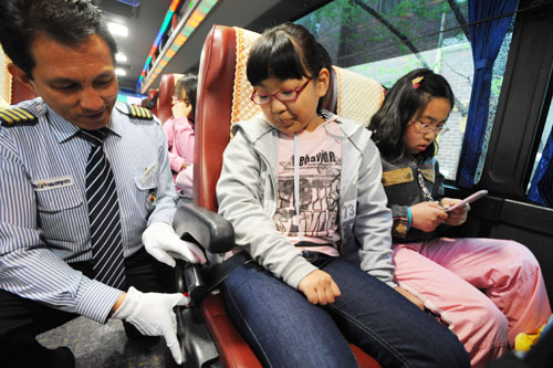 출발에 앞서 버스 기사분이 일일이 학생들의 안전벨트를 점검하고 있다.