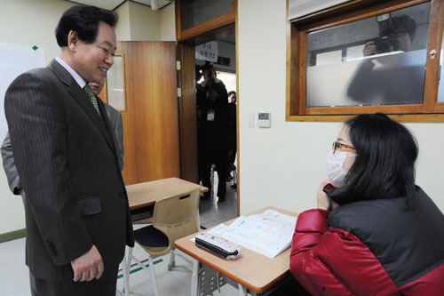 12일 2010학년도 대학수학능력시험이 전국 79개 시험지구 1124개 시험장에서 일제히 치러졌다. 이원희 한국교총회장이 서울 여의도여고에 마련된 고사장을 들러 신종플루 분리고사장에서 수험생을 격려하고 있다.