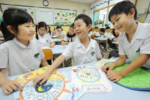 초등학교 여름방학이 시작된 가운데 14일 서울 성북구 성신초등학교 1학년 학생들이 생활계획표를 보며 즐겁게 얘기를 나누고 있다.
