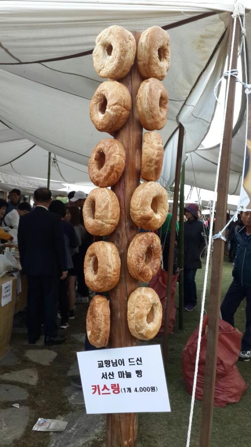 정신없이 축제를 구경하다 보니 출출하다. 어느새 오후 다섯 시가 넘어 있다. 우리는 전통주막에서 갓 구워낸 화전을 사서 함께 먹었다. 방금 만든 것이라 맛이 일품이다. 프란치스코 교황께서 해미를 방문했을 때 직접 드셨다는 키슬링이란 빵도 사 먹었는데 한 개에 4000원으로 좀 비싼 것이 흠이다.