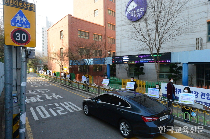 26일 오전 서울보라매초등학교(교장 김갑철) 선생님들이 25일부터 시행된 학교 앞 어린이 교통안전을 강화한 '민식이법'과 관련하여 계몽활동을 하고 있다.