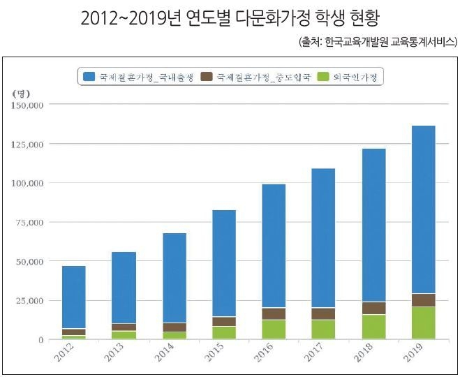다문화학생 비율이 전국적으로 점차 늘어나고 있습니다. 이로 인해 대다수 시·도교육청에서는 지방자치단체와 연계하여 많은 예산과 인력을 투입하여 내실 있는 다문화교육 및 세계시민교육을 실시하고 있습니다. 덕분에 다문화학생들은 학교의 테두리 안에서 한국 사회에 빠르게 적응하기 위해 노력하고 있고, 언론이나 방송을 통해 미담 사례를 일부 확인할 수 있습니다.