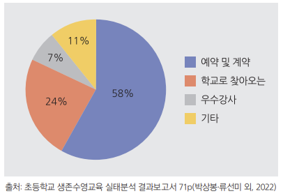 그러나 학교현장에서는 2시간의 수업을 위해 더 많은 시간 동안 이동하느라 편법적인 교육과정 운영이 되고, 그나마도 선생님들이 수영장 계약이나 수영강사 채용 같은 어려운 일들을 해내면서 묵묵히 해오던 것이 코로나19로 인해 멈춰 섰다. 미약하나마 교실에서 이루어지고, 이제 다시 시작하려니 가르칠 사람도 가르칠 곳도 구하기 어렵고, 수영을 못하는 생존수영 강사가 있는 것도 사실이다.