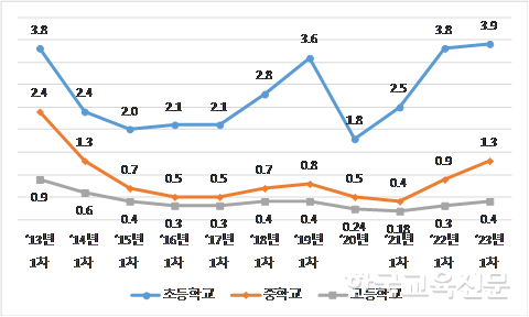 이는 지난해보다 0.2%포인트(p) 상승한 것으로 2013년 2.2% 이후 가장 높은 비율이다. 학교폭력피해 응답률은 코로나19로 인해 비대면 학습이 늘면서 2020년 0.9%까지 떨어졌지만 이후 2021년 1.1%, 2022년 1.7% 등 상승세를 지속하고 있다.