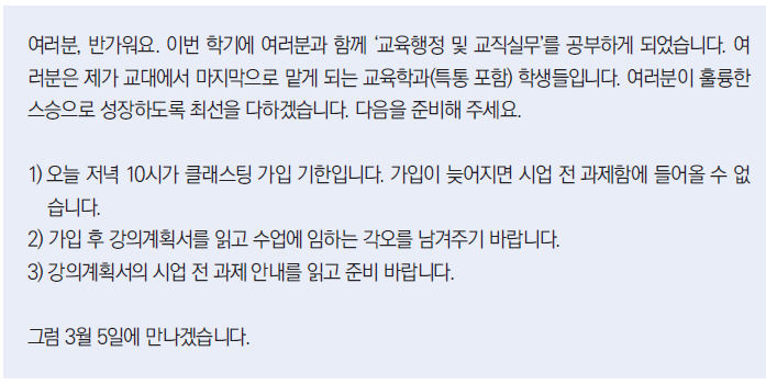 2월 중순에 완전히 수정된 강의계획서를 대학 학사시스템에 탑재하고, 곧바로 내 강의용 LMS인 ‘클래스팅’에 강의실을 개설한 후 강의계획서와 인사말을 올렸다. 강의 안내 동영상도 시청하도록 링크를 제공했다. 강의 시작 2주 전에 해당 학과대표 연락처를 받아, 전체 학생들에게 전달하라며 상세한 문자를 보냈다.