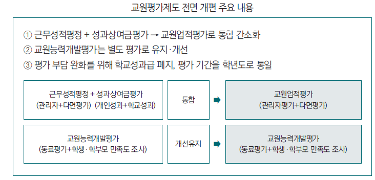 나. 2015년 교원평가 전면 개편을 통해서 중복된 평가를 통합·단순화하여 교원업적평가와 교원능력개발평가의 이원화 체제로 운영 중