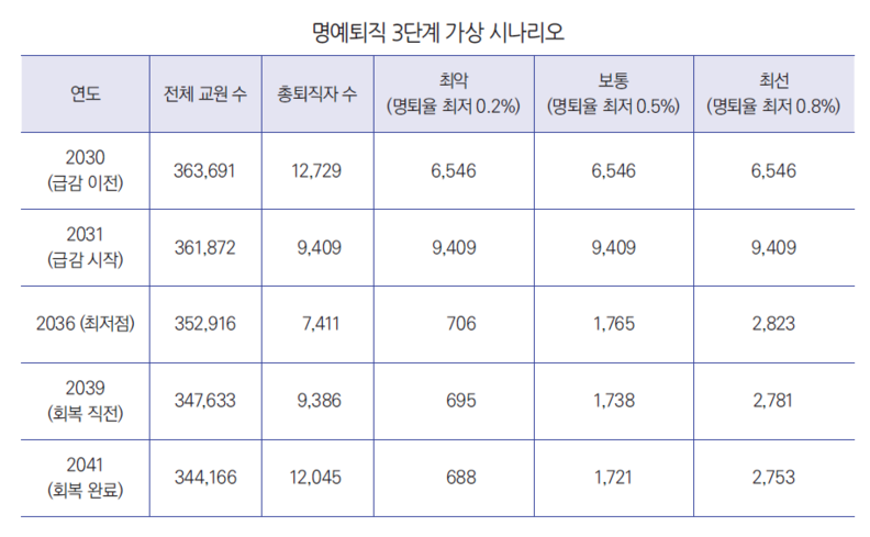 교원들이 명예퇴직을 결정할 때 소득에 얼마큼 영향을 미칠지에 따라, 명예퇴직률의 최저점을 세 가지 시나리오로 나누어 전망해 보면 다음과 같다.