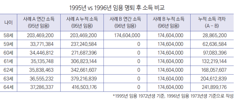 가상의 인물을 설정해서 명예퇴직을 할 때 받는 소득을 한번 분석해 보았다. 교대를 졸업하고 1996년에(만 22세) 임용된 교원이 58세 이후 명예퇴직하면 연금 개시일은 65세이다. 7년간 소득이 없다. 같은 만 22세지만 1995년에 임용된 교사는 58세 명퇴 후 곧바로 연금이 지급된다. 1995년 임용자와 비교하면 소득이 7년 동안 약 2억 4천만 원이 적다. 가장 극단적인 케이스지만 몇 개월 차이로 엄청난 소득 차이가 발생한다.