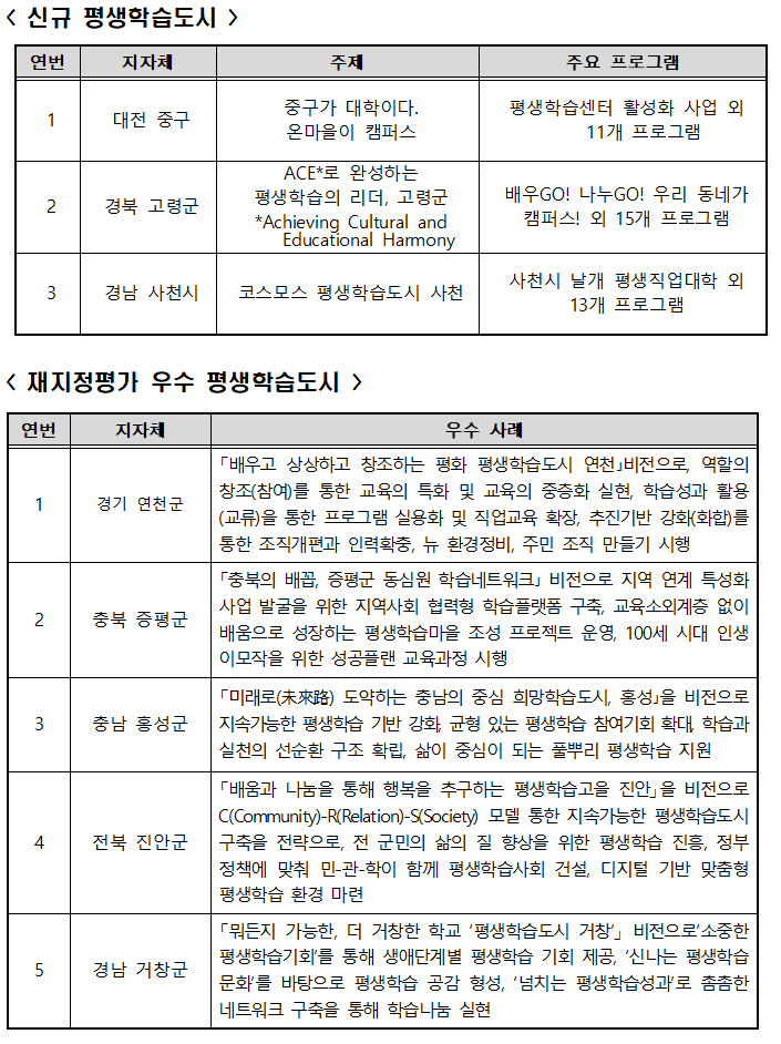 이날 2025년 평생학습도시로 신규 선정된 3개 도시(대전 중구, 경북 고령군, 경남 사천시)에 대한 동판 수여식과 평생학습도시 재지정평가 우수 도시 5개(경기 연천군, 충북 증평군, 충남 홍성군, 전북 진안군, 경남 거창군)에 대한 시상식도 함께 개최된다.