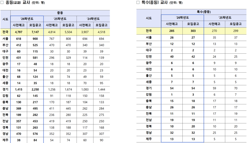 교육부가 1일 발표한 ‘2026학년도 공립 중등·특수(중등)·비교과 신규교사 임용시험 모집공고 현황’에 따르면 중등 신규교사 선발 규모는 7147명이다. 이는 지난 8월 발표한 사전예고 인원 4797명에 비해 2350명, 2025학년도 모집공고 인원 5504명에 비해 1643명 증가한 수치다. 교육부는 “고교학점제 및 과밀학급 지원을 위한 추가 확보분 등을 반영한 것”이라고 설명했다.