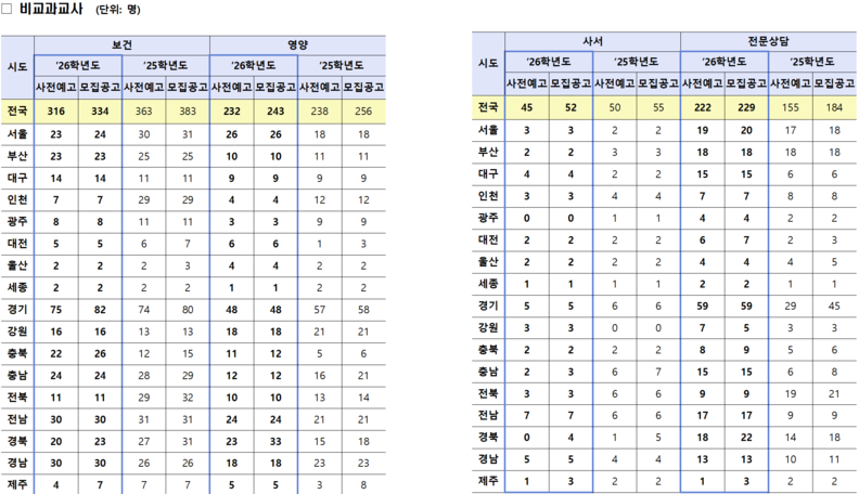 특히 중등은 늘어나지만 특수(중등)·비교과 규모는 전년 대비 소폭 감소한다. 특수는 4명, 전문상담은 45명 늘어나고 나머지는 모두 줄어든다. 감소 규모는 보건이 49명, 영양이 13명, 사서가 3명이다.
