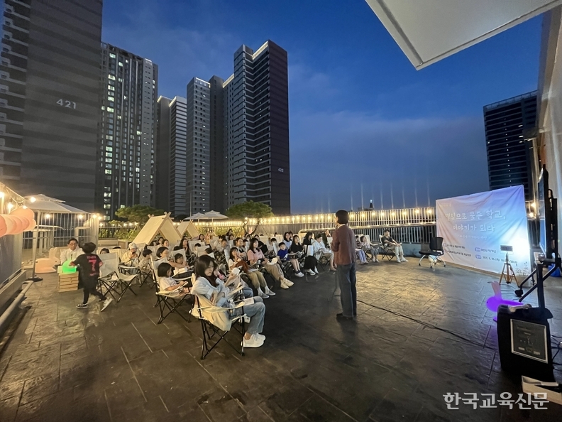 옥상 광장에서는 조명이 은은히 켜지고 돗자리가 펼쳐졌다. 감성적인 캠핑 분위기 속에서 부모와 아이들이 함께 책을 읽으며 대화를 나누었다.
