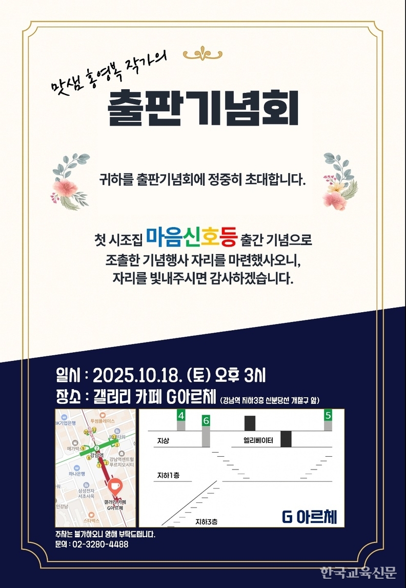 일흔 나이에 옥동자를 탄생시킨 작가가 있다. 시조 쓰는 달콤함에 푹 빠져 밤낮 가리지 않고 작품을 쓴 지 2년, 어언 700여 일. 한 주에 두 세 편씩 쓰다 보니 300편에 이르렀고 이 중 190편을 첫 시조집에 담았다. 6개의 꿀단지에 나누어 총총히 담았다. 맛샘 홍영복(글쓰기 교육자, 작가) 전 서울경일초 교장 이야기다. 그는 오는 10월 18일 오후 3시, 2호선 강남역 7번 출구 갤러리 카페 G아르체에서 첫시조집 「마음신호등」 출판기념회를 갖는다.