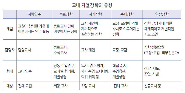 교내 자율장학은 운영 방식과 참여 형태에 따라 자체연수·동료장학·자기장학·수시장학·임상장학 등으로 구분할 수 있다. 각 유형의 구체적인 내용은 아래 <표>와 같다.