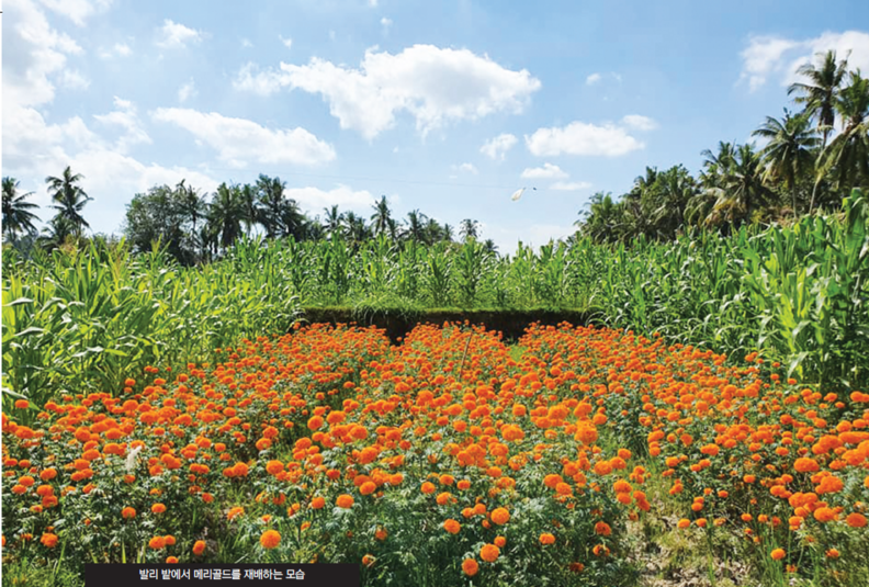 필자는 메리골드 하면 발리가 떠오른다. 발리에 가보니 어디를 가나 메리골드를 볼 수 있었다. 우선 발리 사람들이 신에게 바치는 ‘차낭사리(Canang sari)’에 메리골드가 빠지지 않았다. 차낭사리는 힌두교를 믿는 발리인들이 신에게 바치는 예물이다. 코코넛 잎을 길게 잘라 접시모양을 만들고 그 위에 다양한 빛깔의 꽃과 음식을 조금씩 담은 것이다. 차낭사리는 집이나 거리·가게 등 어디서나 흔히 볼 수 있었다.