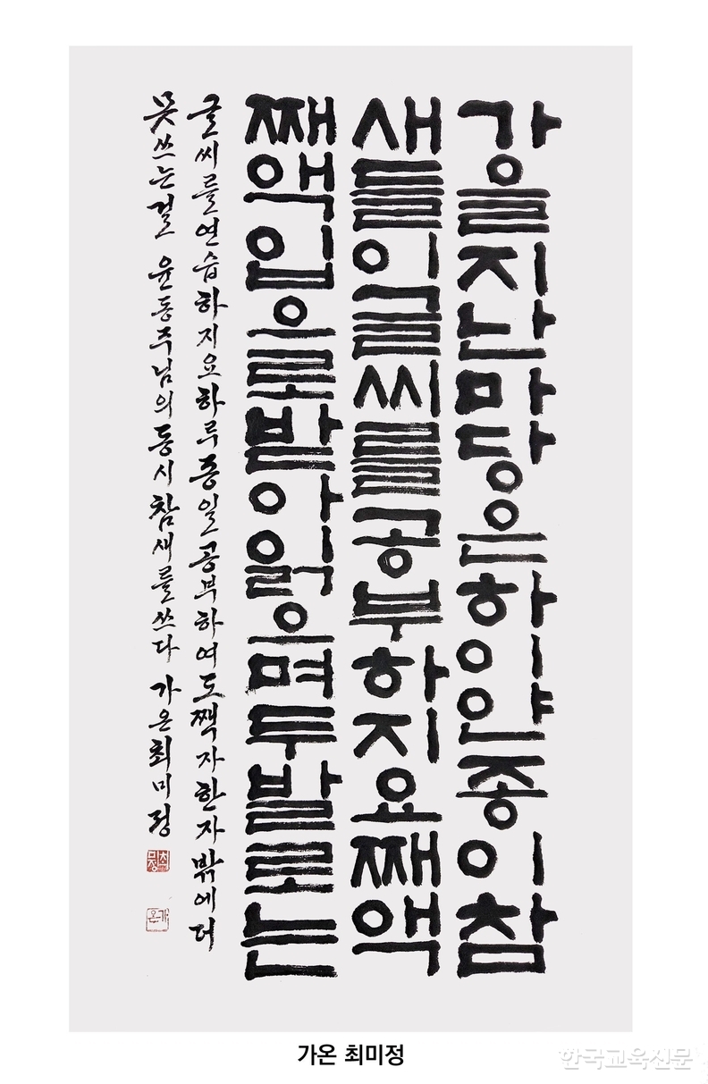 한국서예·캘리그라피교원협회(회장 임성부, 이하 ‘한서교’)가 주최하고 경기대학교서예학과, 국제공익문화예술연대, 아트월드뉴스, 한국서예신문이 후원한 전국 전·현직 교사들의 서예 축전인 '제3회 대한민국교원서예캘리그라피대전' 입상자가 발표됐다.